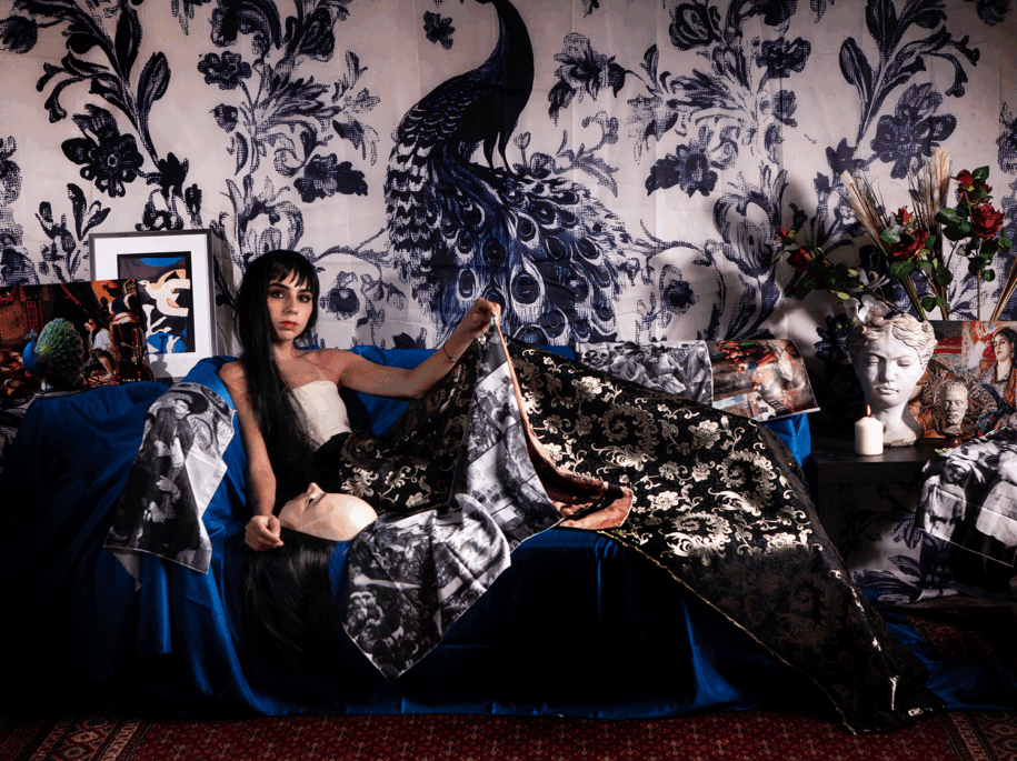 Le diptyque photographique PAON BLEU d’Halida Boughriet s’inscrit dans une démarche de contre-récit. L’œuvre utilise une esthétique luxuriante pour subvertir les codes de l’orientalisme classique, un narratif historiquement hégémonique. En réintégrant des symboles forts (le paon, le tissage, le masque) et en les juxtaposant à des fragments de mémoire traumatique (collages photographiques de la guerre d’Algérie), Boughriet décadre la vision stéréotypée de la femme orientale. Ce faisant, elle forge une nouvelle subjectivité, rendant hommage à Baya et affirmant la résilience et la liberté de regard face aux tentatives d’« énucléation de l’œil » héritées du contexte colonial et patriarcal.